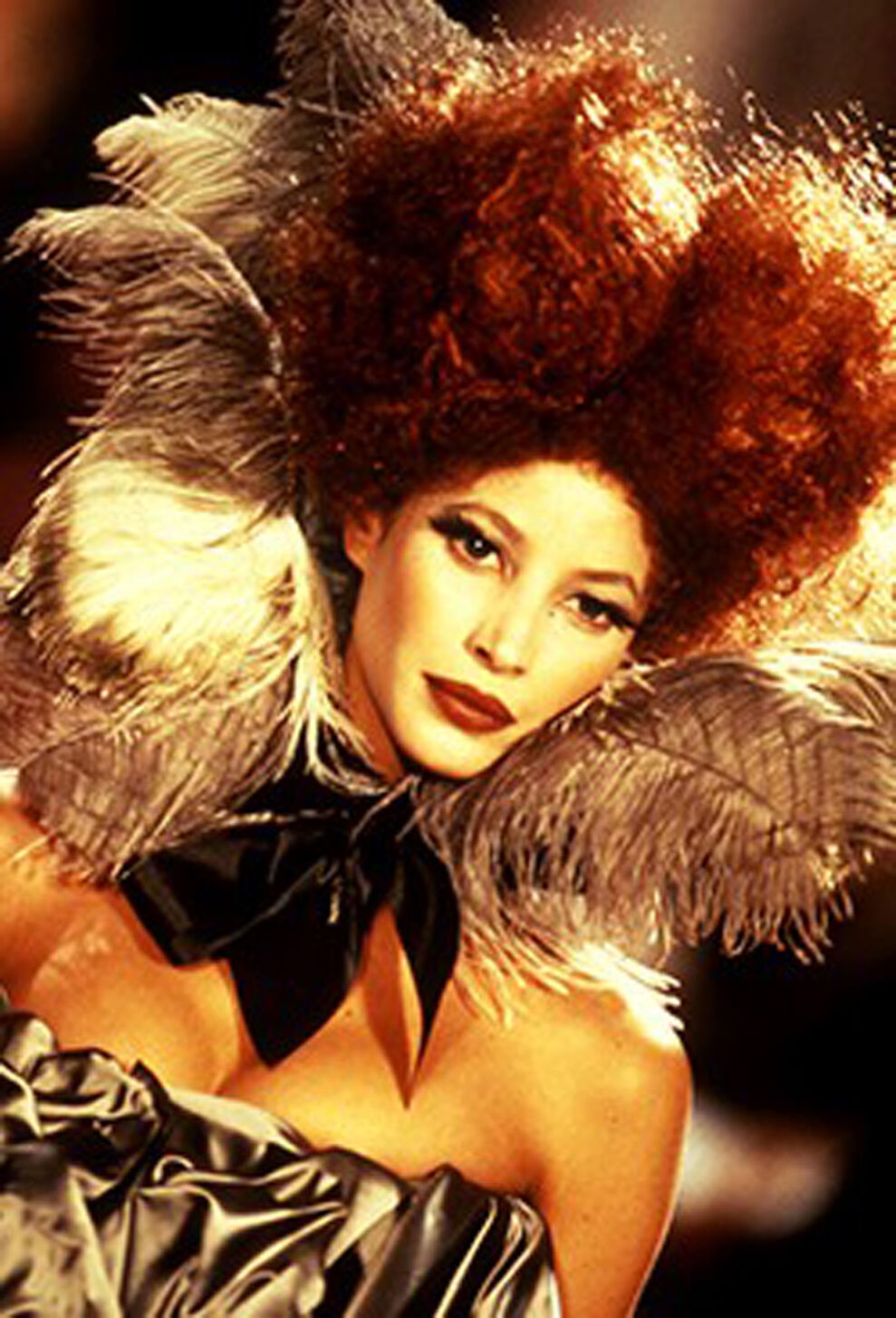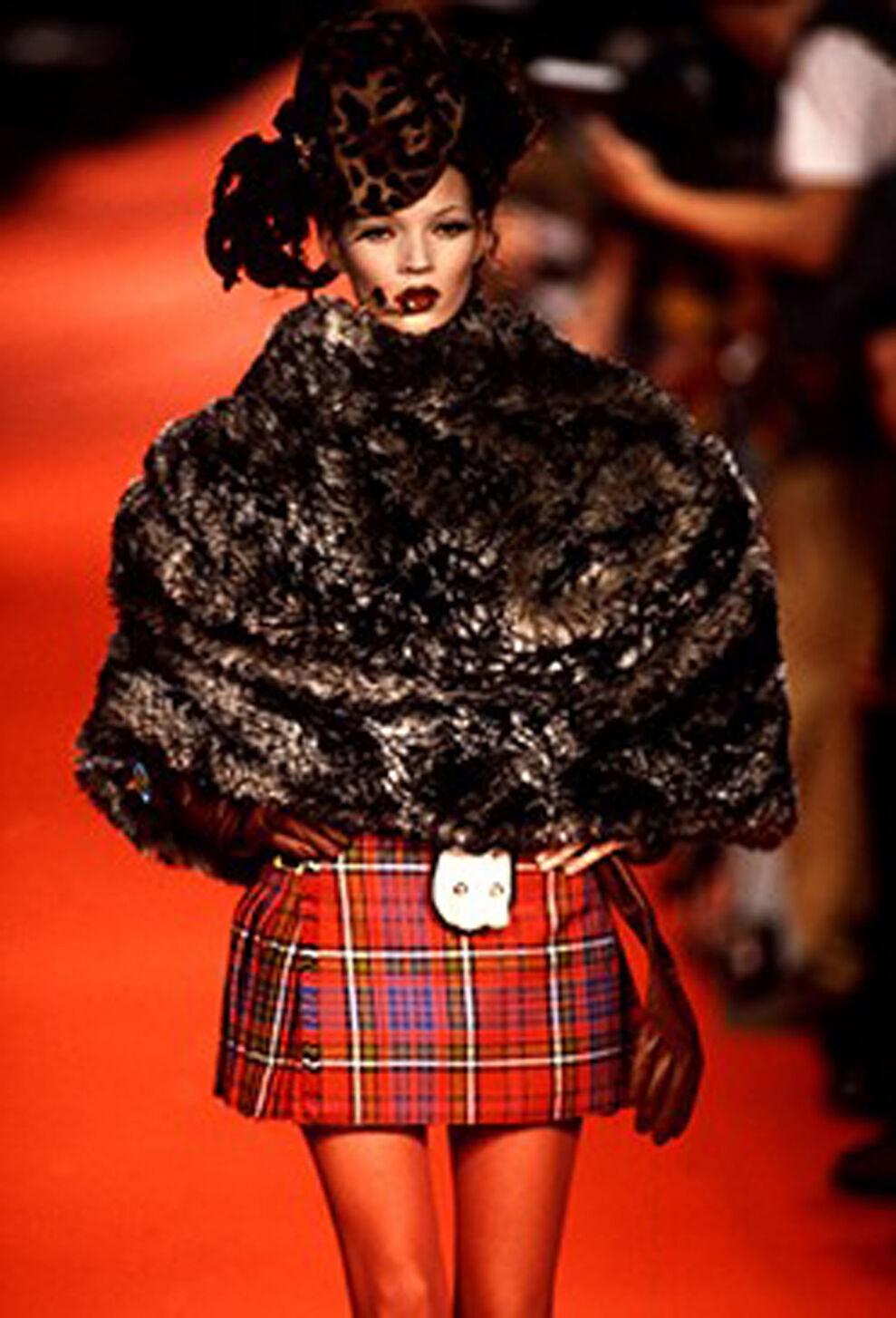 Café Society, Spring-Summer 1994 – Cafes as a continuation of Salons. – A homage to Charles Frederick Worth, the 19th-century founder of French Haute Couture. – The hourglass figure began here with a bustle provided by a cushion. – By this time the volume of the gowns and their trains had reached maximum proportions due to collaboration with Andreas Kronthaler. – Crinoline gowns. – Knitted tassels. – Topless Kate Moss in a micro-mini skirt.- Layered faux furs.