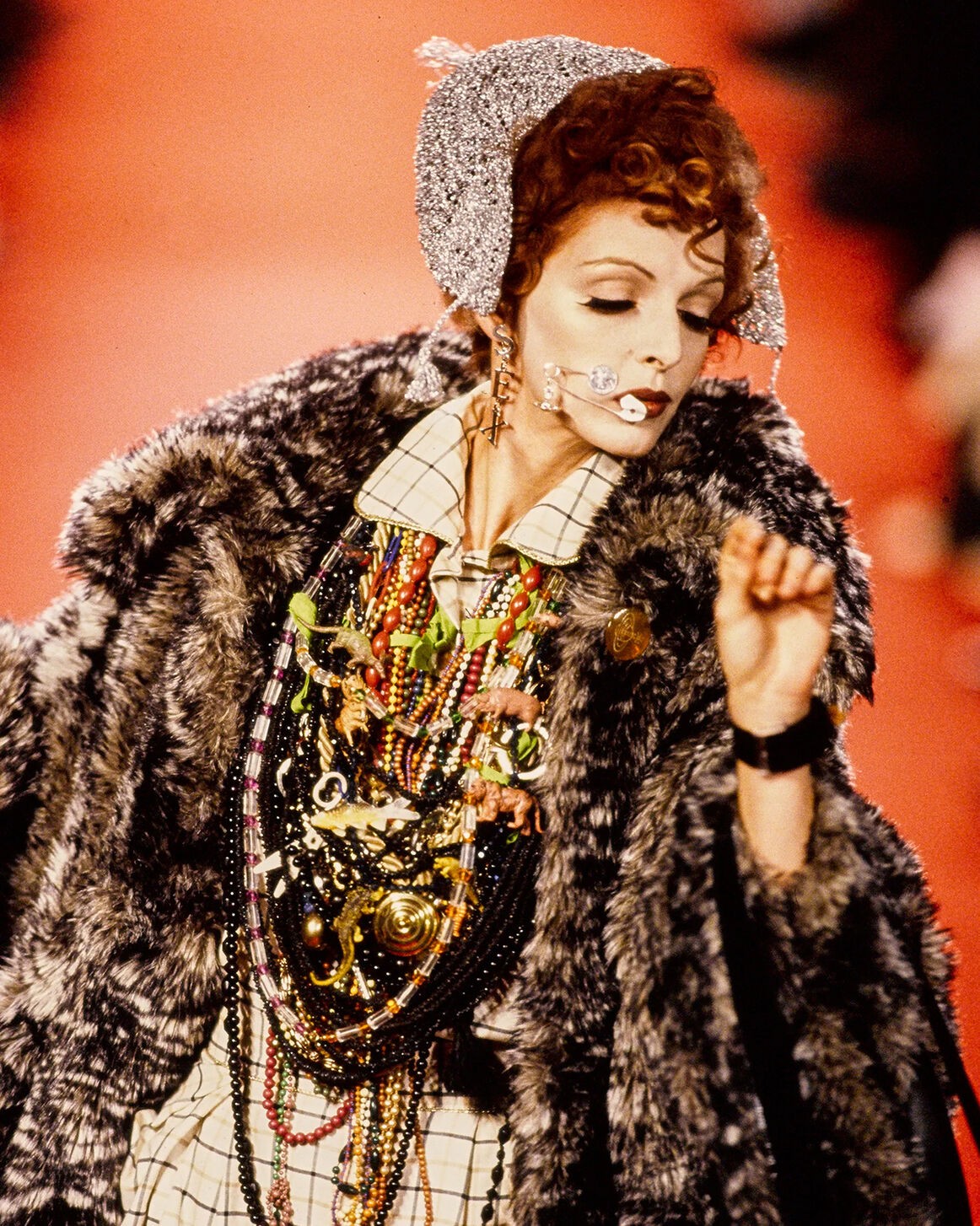 Grand Hotel, Spring-Summer 1993 – In reference to the 1932 Greta Garbo film. – Full skirted ball gowns become a Vivienne Westwood motif. – Hotel lobby rendezvous’. – Pyjama collars. – Vivienne models for the first time. – Endangered animal print. – Inspiration: Saint Laurent and Dior shapes. – Long ‘Circle’ skirt. – Grey suit was worn by Vivienne when receiving her OBE.